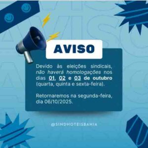 Nos dias 1, 2 e 3 de outubro, das 8h às 17h, o Sindhotéis realiza sua eleição sindical para a escolha da nova Diretoria, Conselho Fiscal, Delegados Representantes e seus respectivos suplentes.