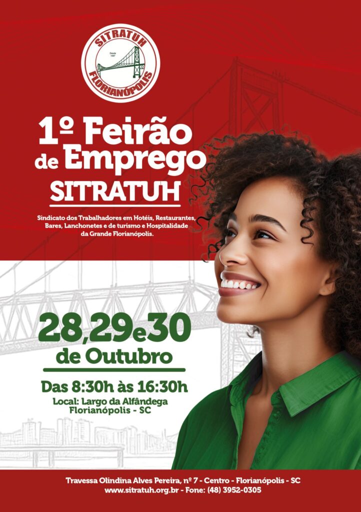 Entre os dias 28 e 30 de outubro, o Largo da Alfândega, o coração de Florianópolis, será palco do 1º Feirão de Emprego SITRATUH — uma iniciativa estratégica para conectar trabalhadores e empresas do setor de turismo e hospitalidade, em antecipação à temporada de verão 2025/2026, que promete ser uma das mais movimentadas da história da capital catarinense.