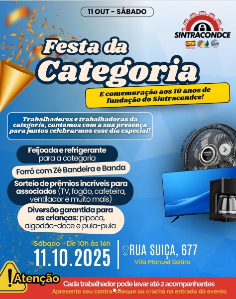 O evento acontece na Rua Suíça, 677 – Vila Manuel Sátiro, das 10h às 16h, e promete reunir trabalhadores e trabalhadoras de toda a base sindical em um dia de confraternização, alegria e reconhecimento.